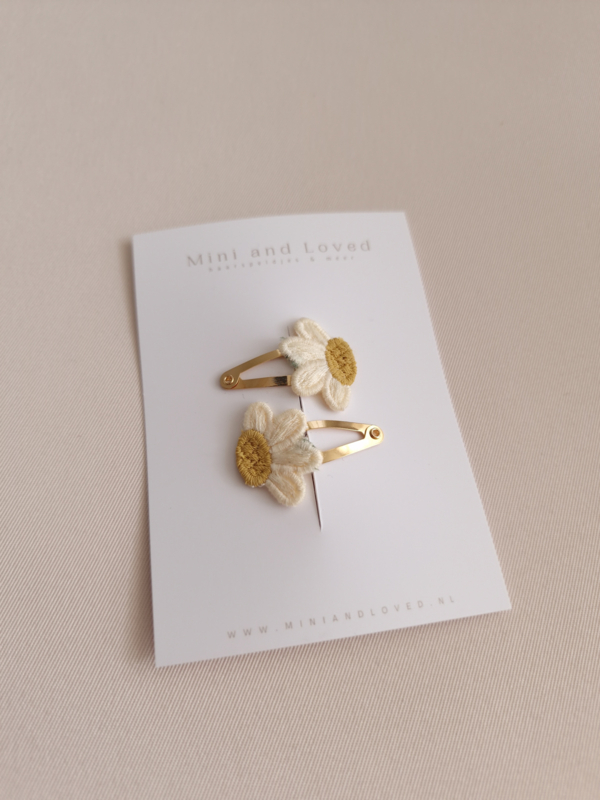 De haarspeldjes met bloem zijn bestelbaar met een goud of zilver klikklak speldje.