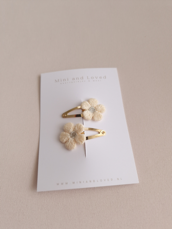 De haarspeldjes met bloem zijn bestelbaar met een goud of zilver klikklak speldje.