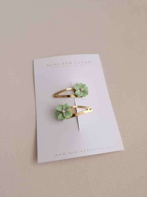 De haarspeldjes met bloem zijn bestelbaar met een goud of zilver klikklak speldje.